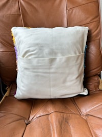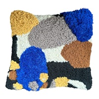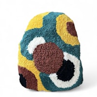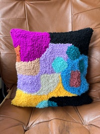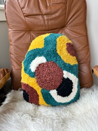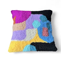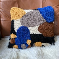 Punch needle throw pillow. Acrylic. 13.5” x 12.5”Includes punch needle throw pillow cover and inner throw pillow stuffed with yarn trimmings from previous tufting projects.