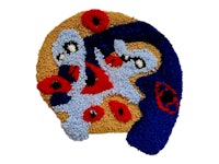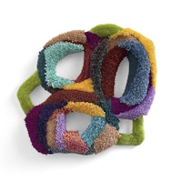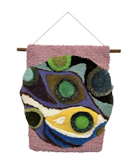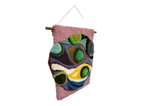 Punch needle wall hanging. Acrylic. 13.5”x 13” at its largest. Finished with one brass D-ring hook on back for easy wall hanging.