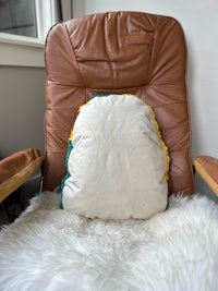 Tufted cotton pillow filled with memory foam. Kind of like a sophisticated squishmallow. Roughly 20” high and 13” wide.